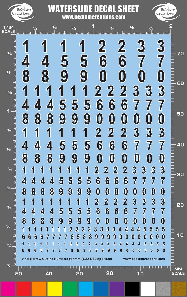 We offer a wide range of number waterslide decals in 7 different font types, 12 different colors, with and without outlines. These decals are printed on a 2″ x 3″ sheet and are packaged individually.